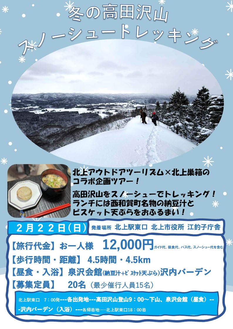 来年2月22日(日)に、北上巣箱さんとコラボしたツアー「冬の高田沢山スノーシュートレッキング」を開催します!