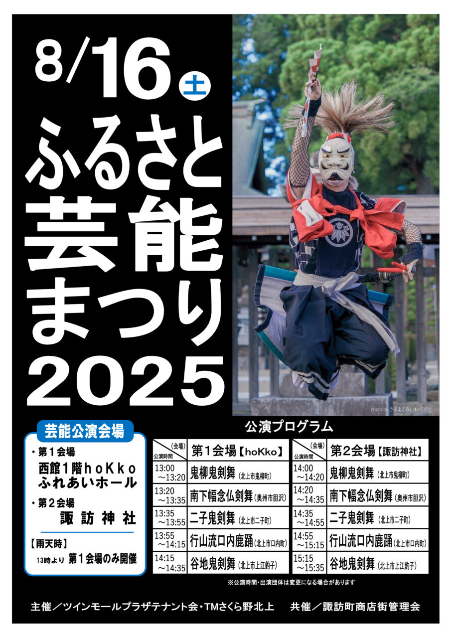 お盆の時期にあわせ、「北上市保健福祉・子育て支援施設hokko(ツインモールプラザ西館)」と「諏訪神社」を会場に芸能公演が行われます。ぜひご家族でご観覧ください!