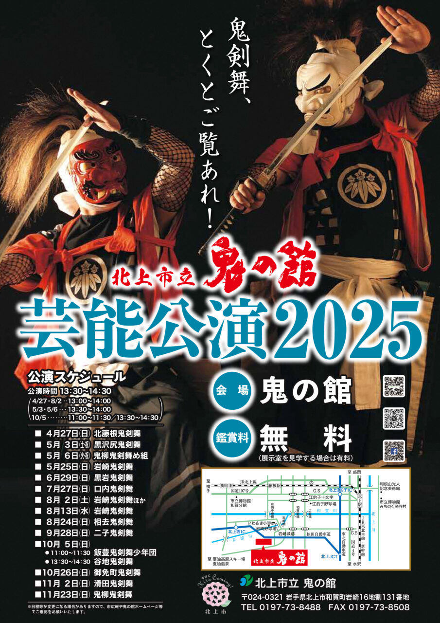 北上市立鬼の館で行われる鬼剣舞定期公演のスケジュールです。