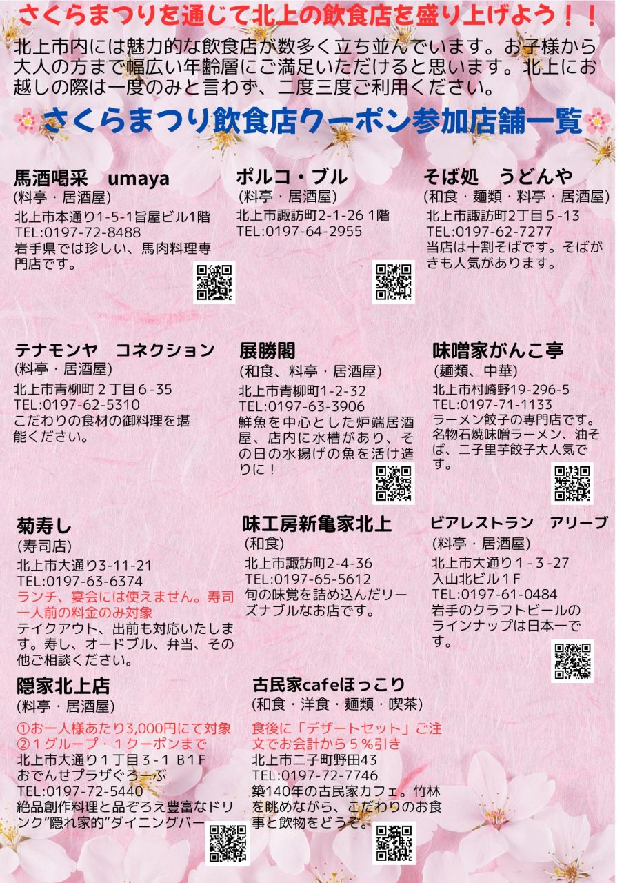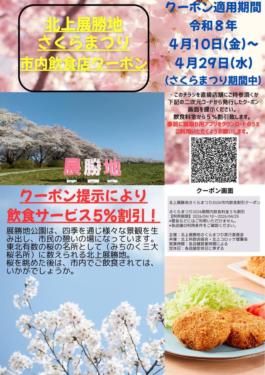 北上展勝地さくらまつり臨時案内所に設置のチラシを対象店舗へご持参いただくか、チラシ内の二次元バーコードから発行したクーポン画面ご提示で、飲食料金から5%割引いたします!