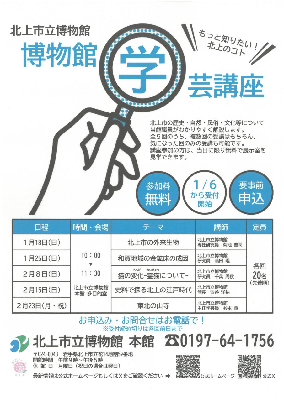 北上市立博物館本館で、北上の歴史、文化、民俗、自然について分かりやすく解説する「博物館学芸講座」を開催します。