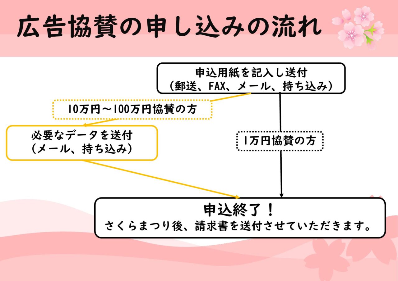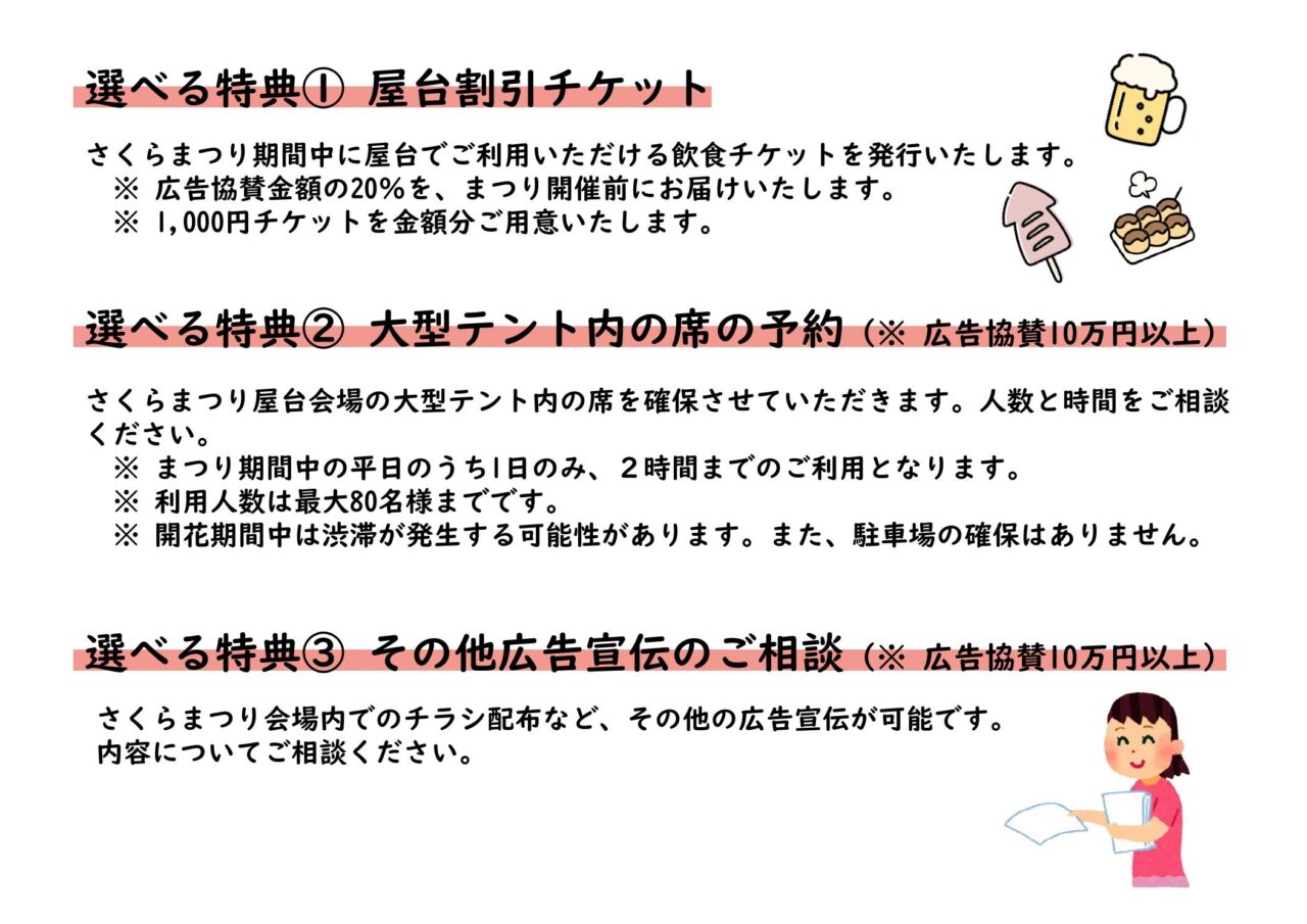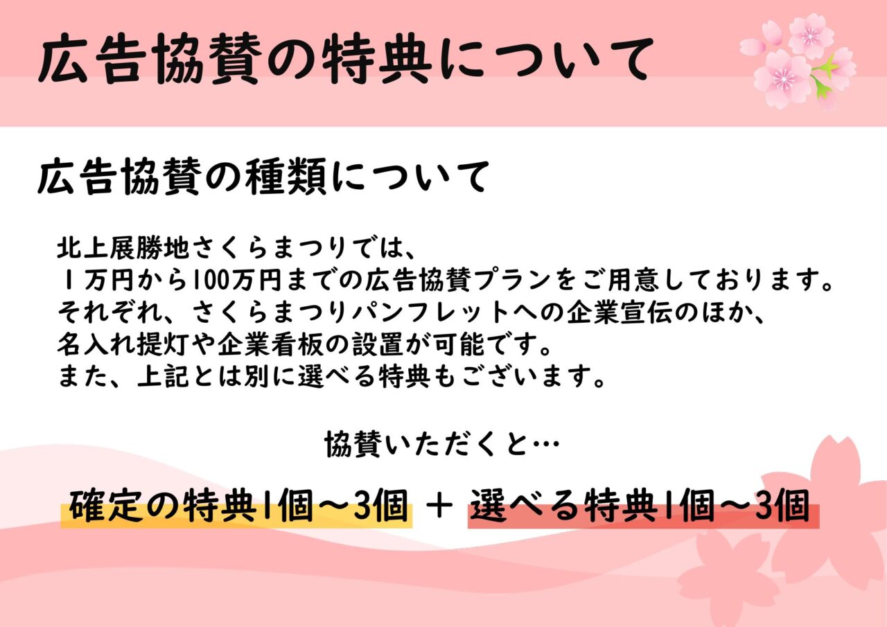 北上展勝地さくらまつりの趣旨をご理解いただき、協賛いただける企業から、イベントの開催に関する費用をいただくものです。広告協賛金は、イベントに関わるその他の収入(補助金等)とともに、イベントの運営経費に充てさせていただきます。