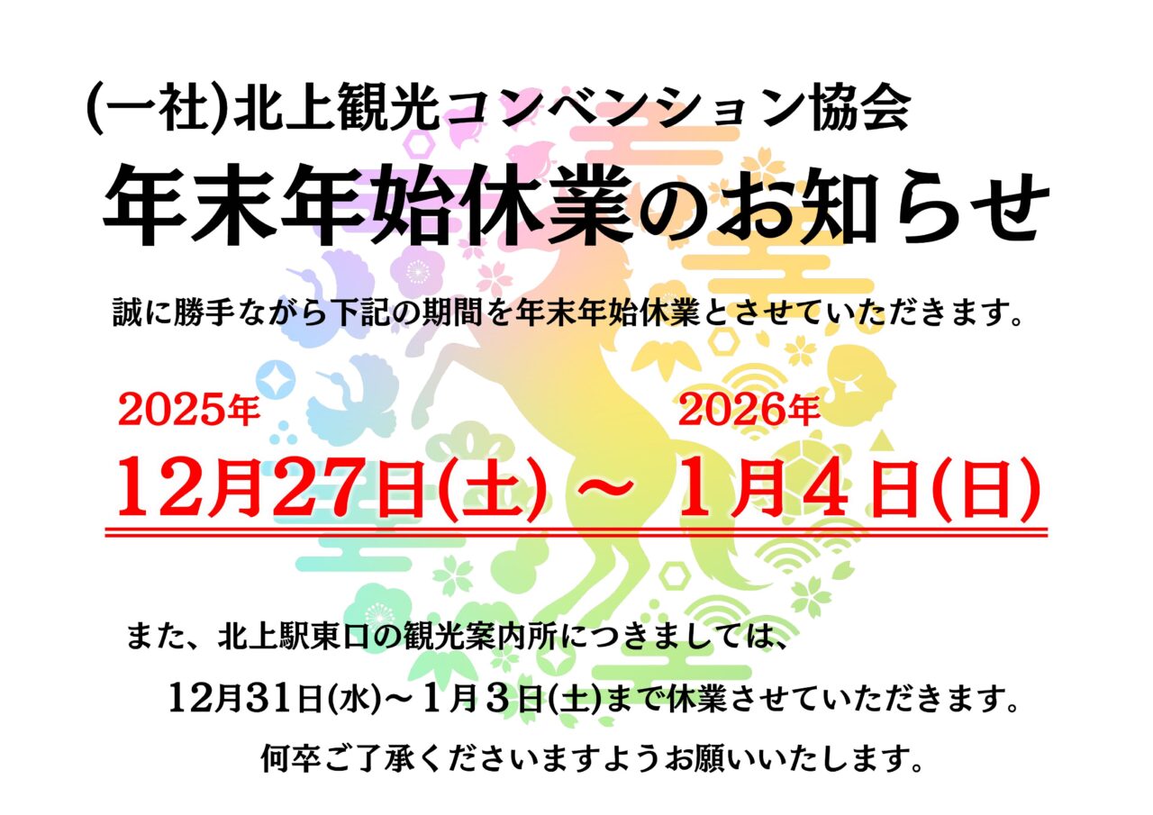 さて、誠に勝手ながら当協会および北上駅東口観光案内所では、下記の期間を休業とさせていただきます。