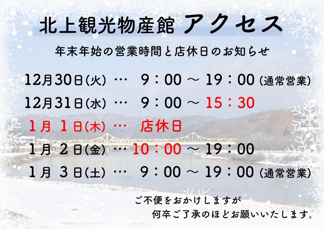 【 北上観光物産館アクセス 年末年始の営業時間・休業日 】