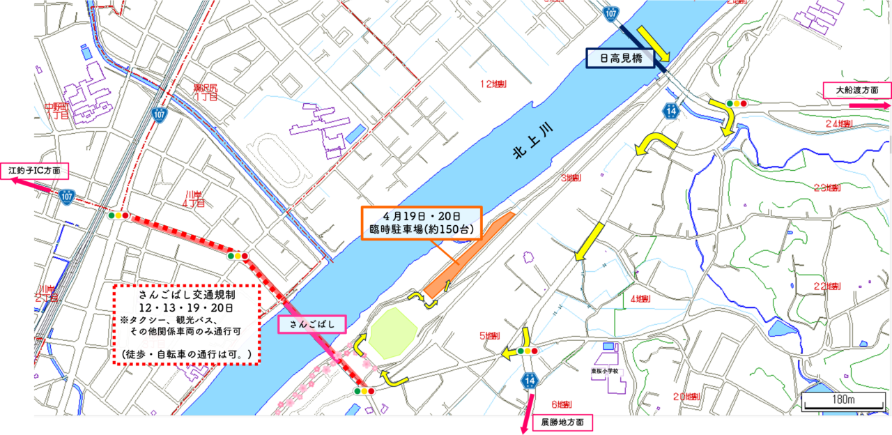 - 当日は珊瑚橋の交通規制を実施いたしますので、臨時駐車場をご利用の際は日高見橋方面よりお越しくださいますようお願いします。