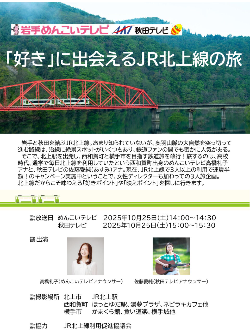 学生時代に北上線を利用していた高橋礼子アナウンサーと佐藤愛純アナウンサーが、北上線沿線の魅力あふれるスポットを探しに行きます。