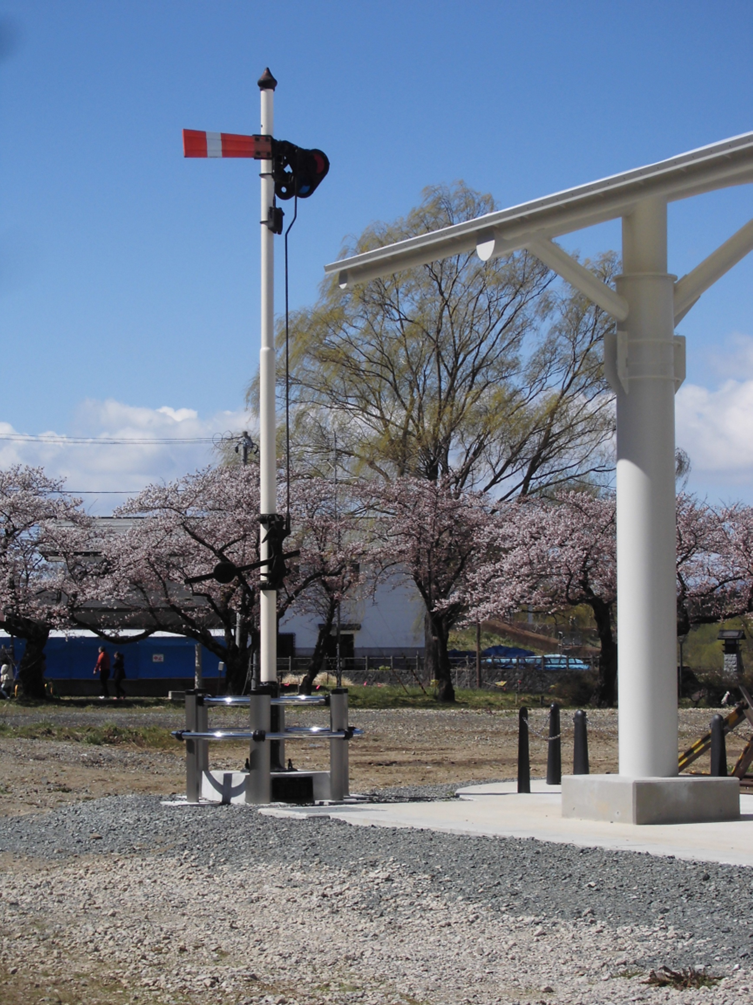 腕木(写真の赤白の板)の角度で進行・停止などの合図を送るアナログ式の信号機