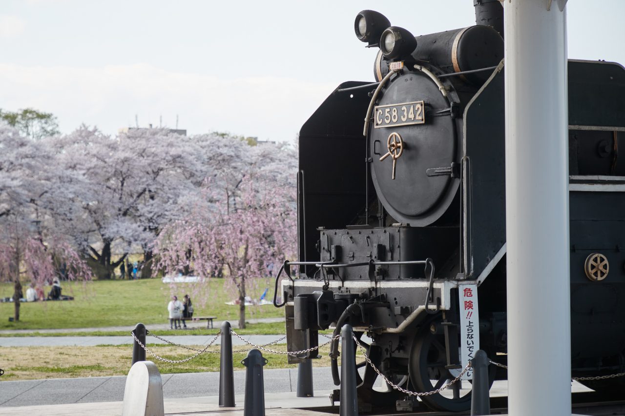 展勝地公園内のSL広場には、C58型のSL(C58 342)、ラッセル車(ロキ228)、緩急車(ワフ29826)、腕木式信号機が設置されており、さくらまつり期間中はSL内部を公開しております。